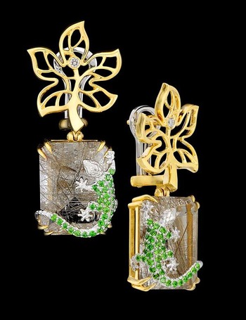 Серьги из коллекции "Мир животных": 18К желтое и белое золото, дымчатый кварц 23,62 ct, бриллианты, цавориты, демантоиды.