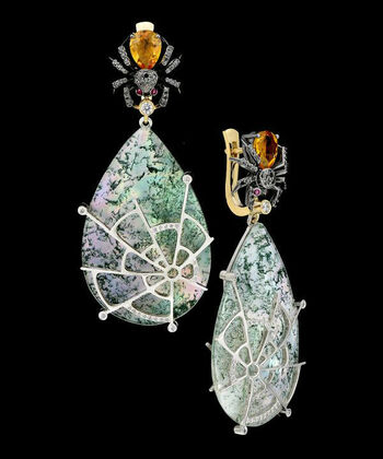 Серьги из коллекции "Мир насекомых": 14К желтое и белое золото, агат 53,86 ct, бриллианты, черные бриллианты, рубины, цитрины.