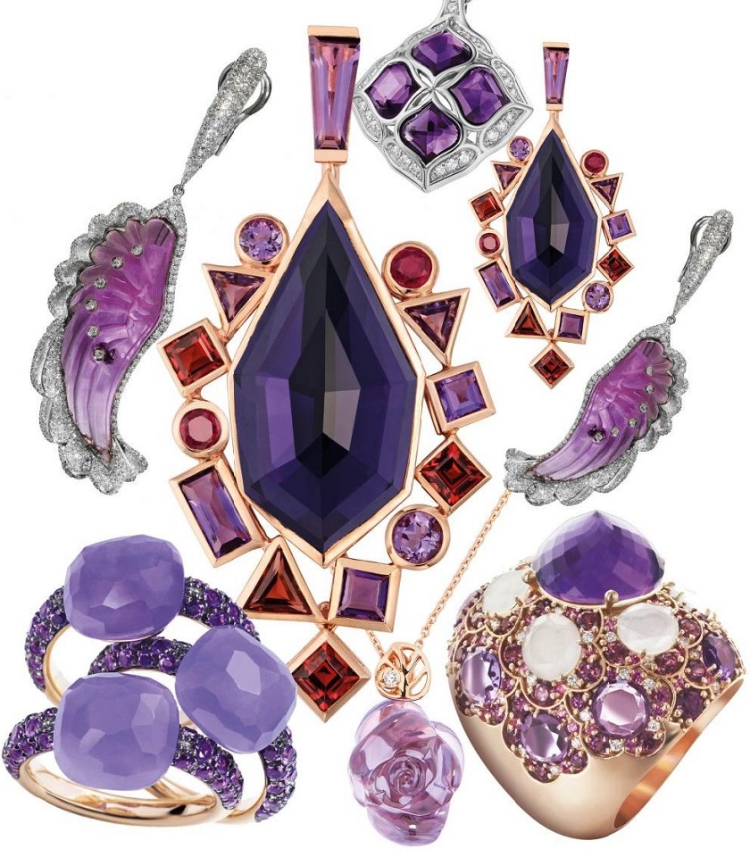 По часовой стрелке: подвеска Imperiale, Chopard (белое золото, бриллианты, аметисты); серьги Gold Struck, Stephen Webster (розовое золото, аметисты, рубины, родолиты, гранаты); серьги Ali Giu, Missbach (белое золото, бриллианты, аметисты); кольцо Lady Taj, Pasquale Bruni (розовое золото, сапфиры, аметисты, бриллианты); колье Rose Dior Pré Catalan, Dior Fine Jewellery (розовое золото, бриллиант, аметист); кольца Capri, Pomellato (розовое золото, лавандовые нефриты, аметисты).