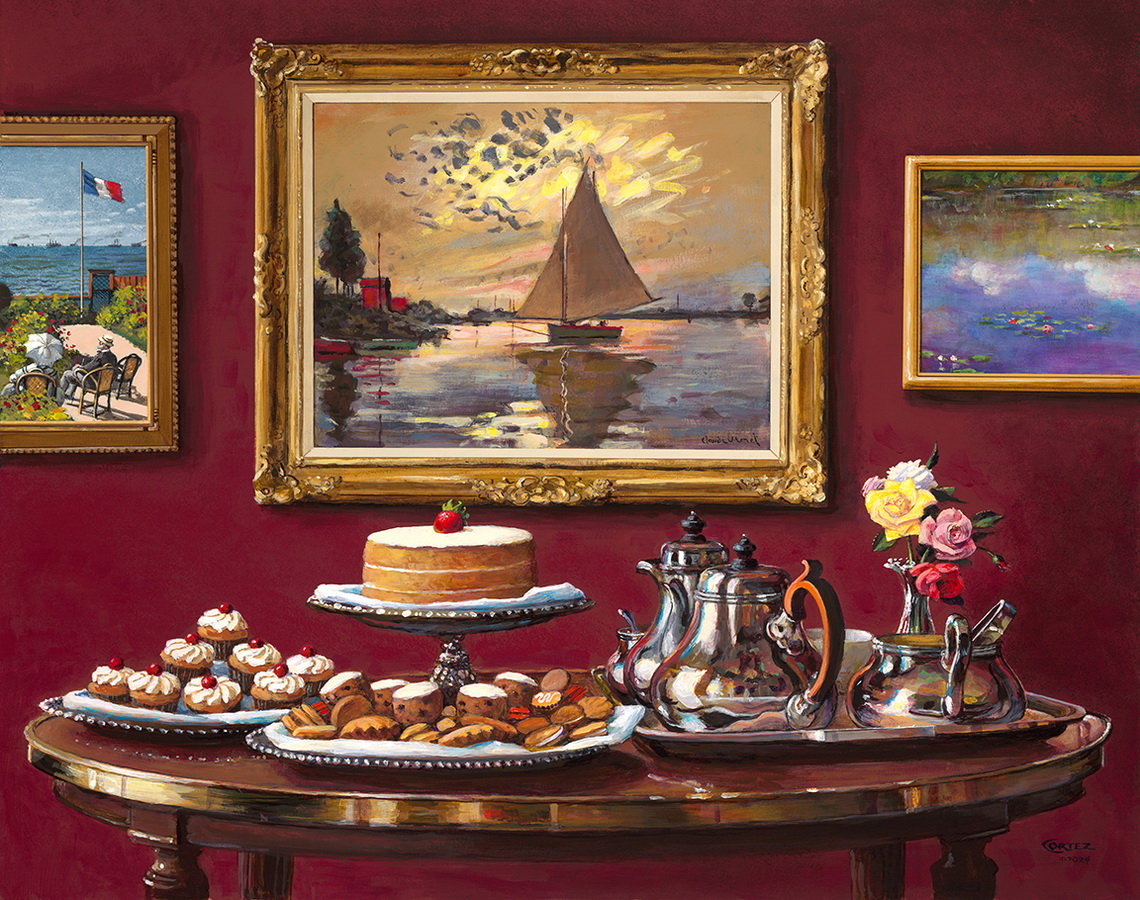 В юности Клод Моне провозгласил две цели: разбогатеть и прославиться. Он добился и того, и другого, и ему доставляло огромное удовольствие делиться своим успехом с другими, достигшими таких же высот. Почетных гостей на собраниях в Живерни всегда угощали самым лучшим. На своей картине я представляю себе сцену после ужина, где множество сладостей представлено перед тремя шедеврами Моне: ранней «Террасой в Сент-Адресс», его прекрасной «Парусной лодкой в Ле Пти-Женвилье» и первой из его длинной и знаменитой серии с водяными лилиями «Облако». Надеюсь, вам тоже понравится этот воображаемый взгляд на жизнь и эпоху Клода Моне.