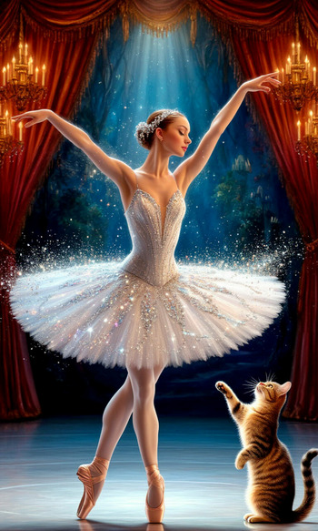 Сцена в театре, идёт балет лебединое озеро, танцует нежная , воздушная балерина. Случайно на сцене сбоку оказался толстый кот, смотрит удивлёнными глазами на танец.