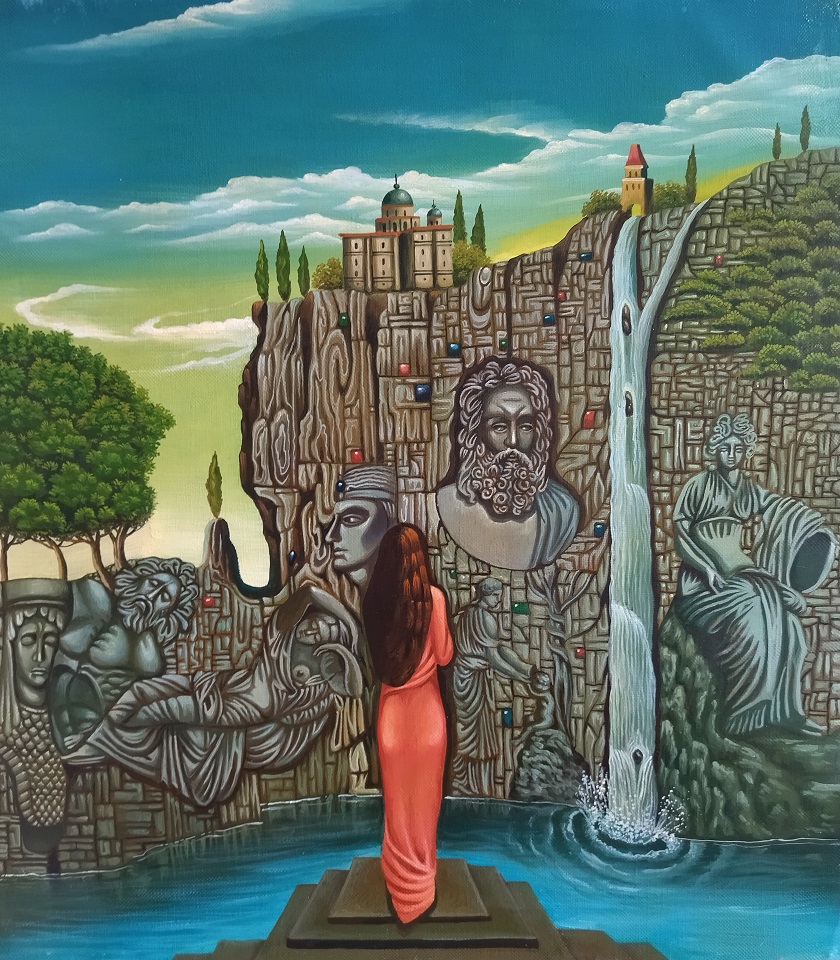 Композиция картины построена так, что взгляд зрителя плавно переходит с переднего плана на задний, от фигуры женщины к скале, замку и небу, создавая ощущение перспективы и глубины.