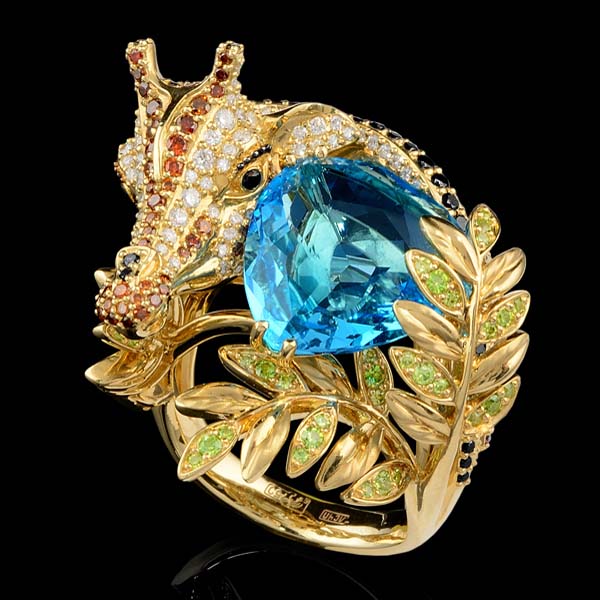 Кольцо из коллекции "Мир животных": 18К желтое золото, топаз 11,78 ct, бриллианты, коньячные бриллианты, черные бриллианты, демантоид.